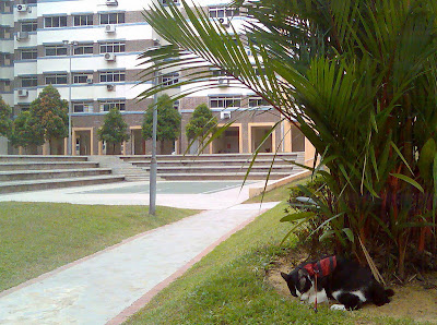 The park was strangely quiet without the usual riot of kids playing football. It was rather nice but even Bujang felt it. This park would usually be quite noisy with kids running about but I guess the police crackdown on kids and noise pollution was effective. I do not know what has come over my cat Bujang but today, he made many new decisions of where he would walk and how he would do it. I was only glad he made different choices as it made walking him much more interesting. Usually I would just have to watch him smell the ixora and eat grass :)