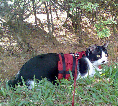 This father and son team fed Tiger Kitty with a can of Fancy Feast (I saw this tin as his son held it when coming to see Bujang in the park). When I saw him from where I was, I watched to see what would happen and I was glad to see that they cleaned up the area after they had fed her. Then they cycled away and I saw Tiger Kitty coming after them. The father saw us and told his son about Bujang in his harness and leash. The son came to take a peek at Bujang but we didn't say anything to each other.