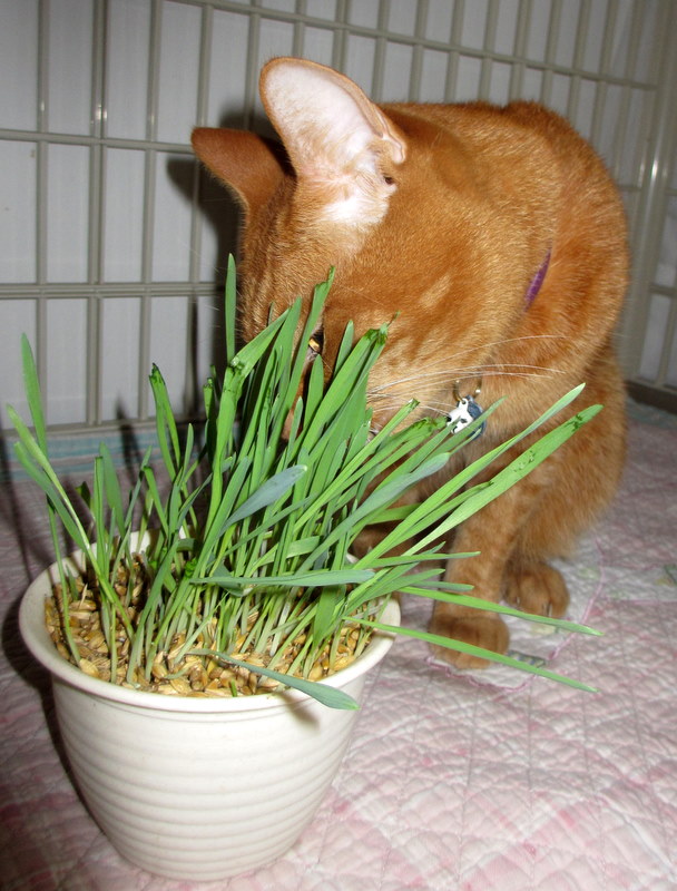 san always gives me a pot just for myself as I lurve grass. This is biograss and san buys the seeds from the petshop. I do not like the wheatgrass from the supermarket. san says the reason I like my own pot of grass might be because I like the smells of the sun and soil on it. It's also much softer than the wheatgrass. She needs to plant a new pot every 2 weeks.