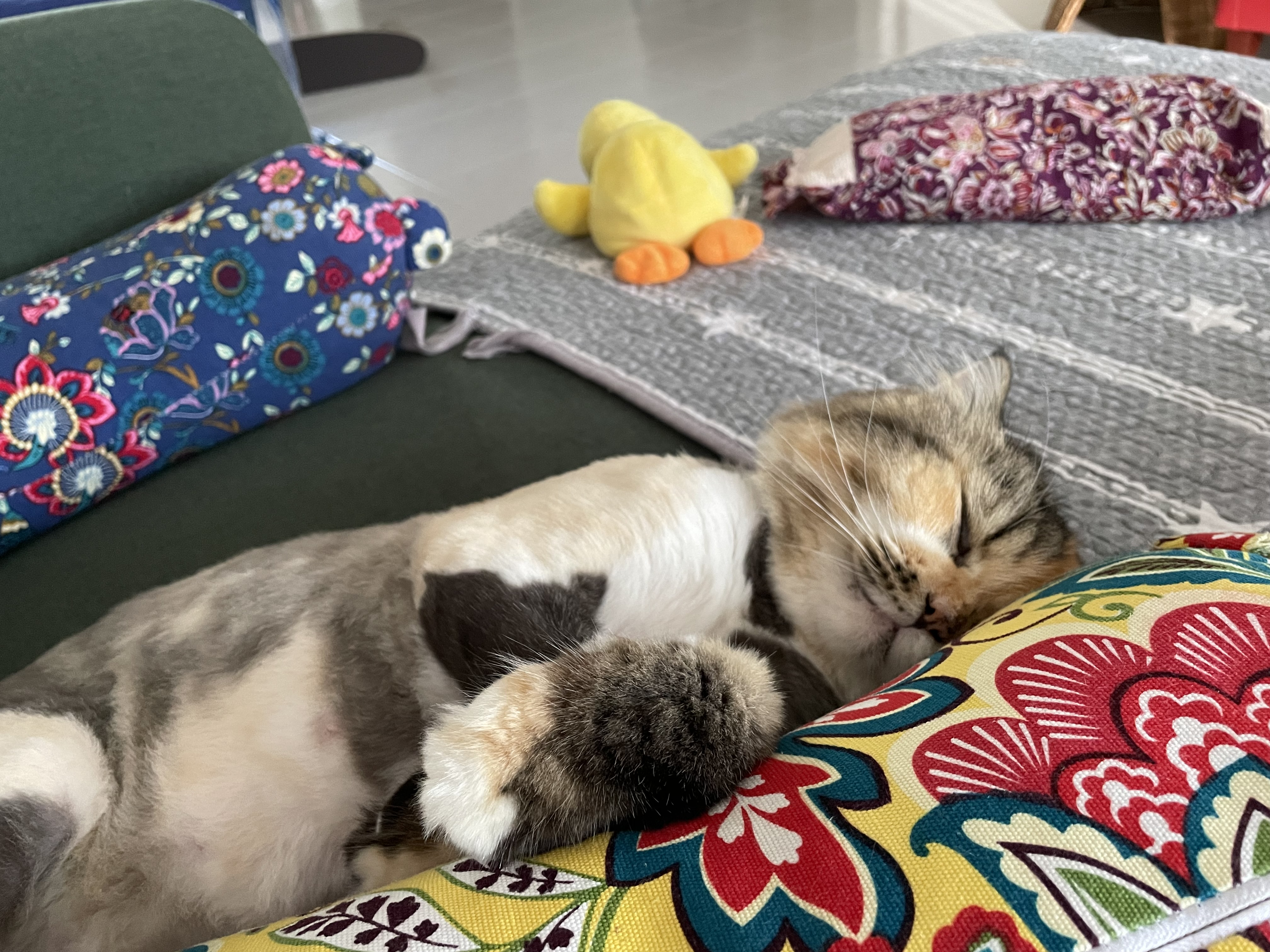 I was feeling much better yesterday and decided to sleep on the couch next to san. san also gave me duckie back again. I suspect she wants to put tiger in the wash as she said he was black with saliva. I do not see what the problem is as he is my tiger and he sleeps with me. I don’t understand san’s obsession with washing.